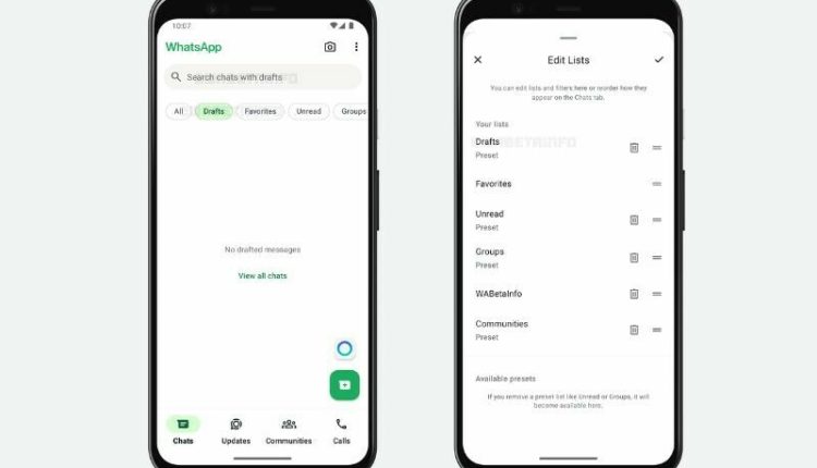 واٹس ایپ کا یہ نیا فیچر صارفین کو صرف وہ چیٹس دکھائے گا، جن میں پیغامات ادھورے چھوڑے گئے ہوں۔اس فیچر میں ہر ڈرافٹ چیٹ کو فہرست میں سبز رنگ کے ’ڈرافٹ‘ انڈیکیٹر سے نمایاں کیا جائے گا، جو وقت بچانے اور گفتگو کی روانی میں مددگار ثابت ہوگا۔واٹس ایپ کی اس نئی اپڈیٹ کے بعد چیٹ لسٹ فلٹر بار میں تبدیلی ہوجائے گی، جس میں ’ان ریڈ‘ اور ’آل‘ کے ساتھ اب ’ڈرافٹ‘ کا آپشن بھی دستیاب ہوگا۔