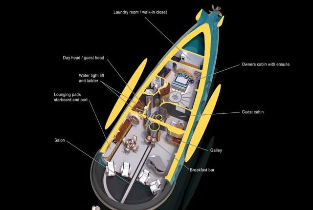 پیش کی گئی تصویر کے مطابق اس آبدوز میں سیلون، مہمانوں کا کیبن، مالک کا کیبن اور لانڈری روم ایک ترتیب میں دکھائے گئے ہیں۔