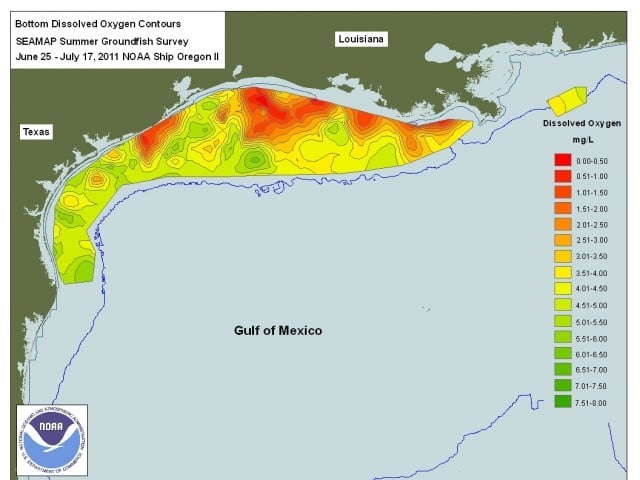 نیشنل اوشین سروس (این او اے اے) کے تعاون سے سائنسدانوں نے ایک رپورٹ شائع کی جس کے مطابق خلیج میکسیکو کا “ڈیڈ زون” (کمیاب آکسیجن والے خطہ) اس سال ریکارڈ پر دنیا کا 12 واں سب سے بڑا ڈیڈ زون علاقہ بن گیا ہے۔