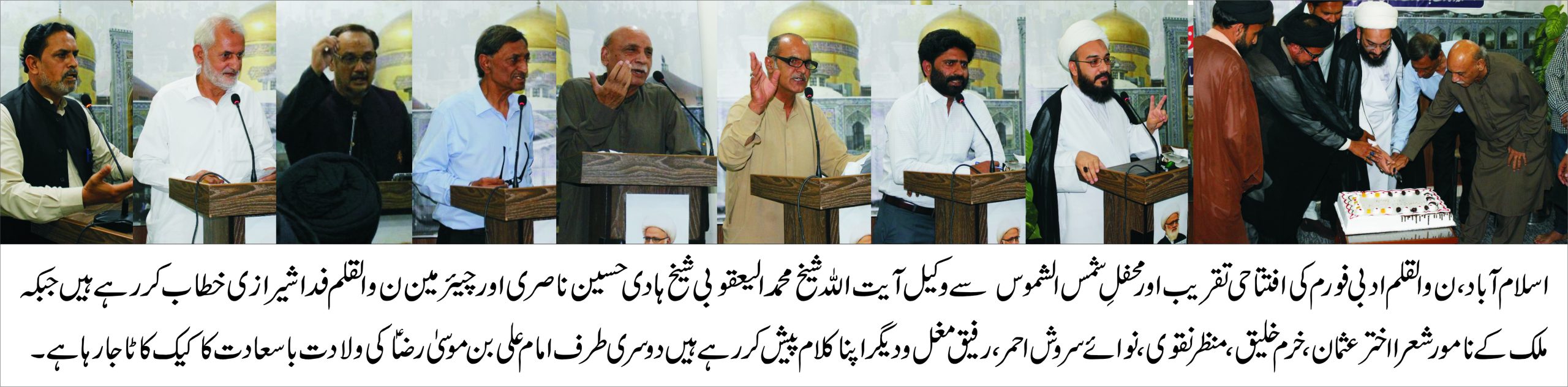 اسلام آباد(شوریٰ نیوز)ن والقلم ادبی فورم کی افتتاحی تقریب اور ولادت باسعادت امام علی موسیٰ رضاؑکے موقع پر مشاعرہ بعنوان محفل شمس الشموس کا انعقاد کیا گیا جس میں پاکستان میں آیت اللہ العظمیٰ شیخ محمد یعقوبی کے وکیل اور شوریٰ تبلیغ اسلامی کے سرپرست اعلیٰ شیخ ہادی حسین ناصری نے بطور خاص شرکت جبکہ مشاعرہ کی صدارت معروف شاعر اخترعثمان نے کی جب کہ خرم خلیق، منظر نقوی، نوائے سروش احمر،ناصر منگل،رفیق مغل،سبطین شیرازی ،فداشیرازی اور دیگر نے امام علی رضا ؑ کے حضور نذرانہ عقیدت پیش کیانظامت کے فرائض سید فدا حسنین شیرازی اور علامہ اعجاز مظاہری نے سرانجام دیئے تقریب میں علمائے کرام کی بڑی تعداد شریک تھی۔ شیخ ہادی حسین ناصری نے تقریب سے خطاب کرتے ہوئے کہا کہ ن و القلم ادبی فورم کے قیام پر فدا شیرازی اور اُن کی ٹیم کومبارکباد پیش کرتا ہوں اُمید ہے آنیوالے وقت میں یہ تنظیم ملک بھر میں ادبی خدمات میں اپنا وقار بلند رکھے گی انہوں نے کہا کہ علمائے کرام کو شعراسے خصوصی محبت ہے کیونکہ شعرا دریا کو کوزے میں بند کرنے کے ماہر ہیں انہوں نے کہا کہ امام علی بن موسیٰ رضا کے حوالے سے محفل شمس الشموس مشاعرہ کا انعقاد ایک قابل تحسین عمل ہے ۔ تقریب کے آخر میں امام علی رضاؑ کی سالگرہ کا کیک کاٹا گیا۔