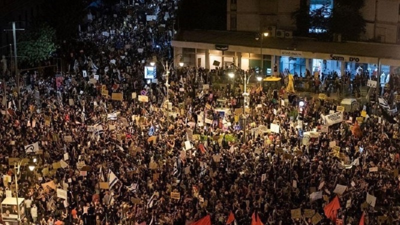 مقبوضہ فلسطین کے مختلف علاقوں میں نسل کش صیہونی حکومت کی کابینہ کے خلاف زبردست مظاہروں کا سلسلہ جاری ہے۔ صیہونی مظاہرین مقبوضہ علاقوں میں بڑے پیمانے پر سڑکوں پر مظاہرے کر کے نیتن یاہو کی کابینہ کے استعفے اور قبل از وقت انتخابات کے انعقاد کا مطالبہ کر رہے ہیں۔