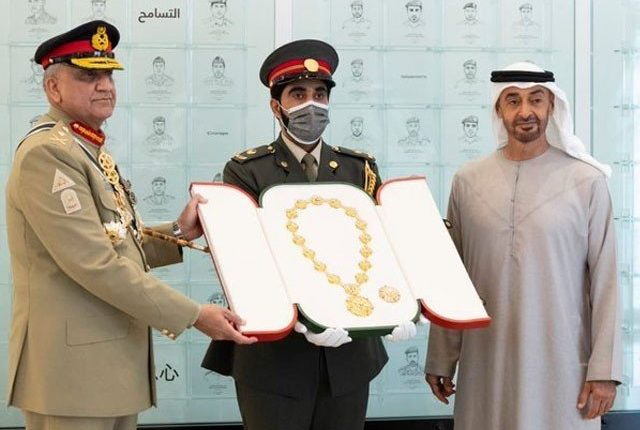 آرمی چیف جنرل قمر جاوید باجوہ کو دونوں ممالک کے درمیان دوطرفہ تعلقات کے فروغ میں اہم کردار ادا کرنے پر یو اے ای کے صدر نے آرڈر آف دی یونین میڈل سے نوازا۔