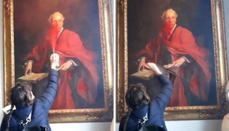 وأظهر مقطع مصور نشرته مجموعة “العمل الفلسطيني” الاحتجاجية على وسائل التواصل الاجتماعي امرأة ترش طلاء أحمر على الصورة قبل أن تمزقها بسكين، في أحدث موجة من الاحتجاجات التي أثارتها الحرب بين “إسرائيل” وحركة المقاومة الإسلامية الفلسطينية (حماس).