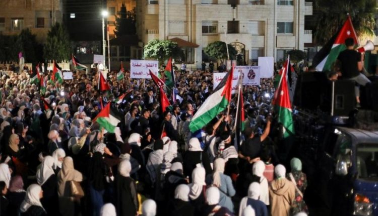احتشد آلاف الأردنيين لليوم الثاني عشر على التوالي قرب سفارة الاحتلال الإسرائيلي في العاصمة عمّان، مطالبين إلغاء اتفاقيتي وادي عربة والغاز، ووقف الجسر البري الذي ينقل بضائع من دول خليجية باتجاه كيان الاحتلال عبر الأراضي الأردنية.