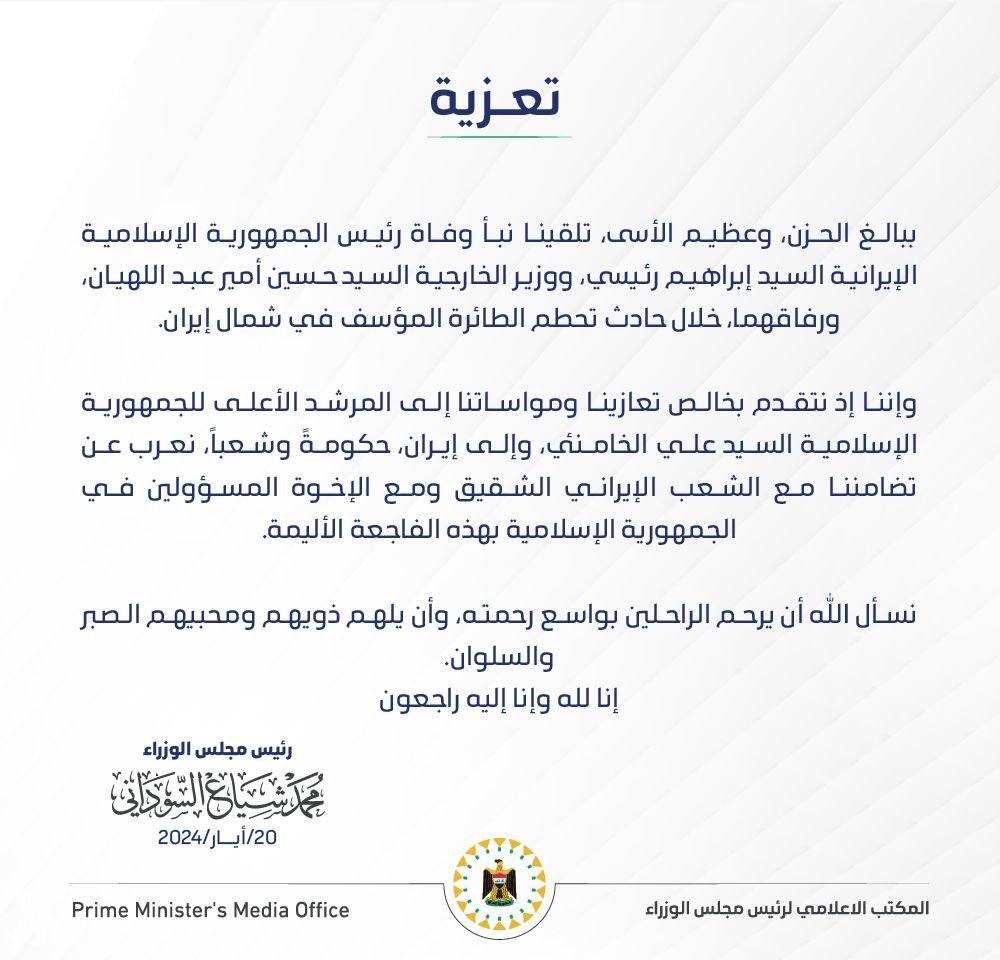 قدم رئيس وزراء العراق محمد شياع السوداني التعازي للحكومة الإيرانية وشعبها بحادثة استشهاد الرئيس إبراهيم رئيس ومرافقيه في حادث تحطم طائرتهم.