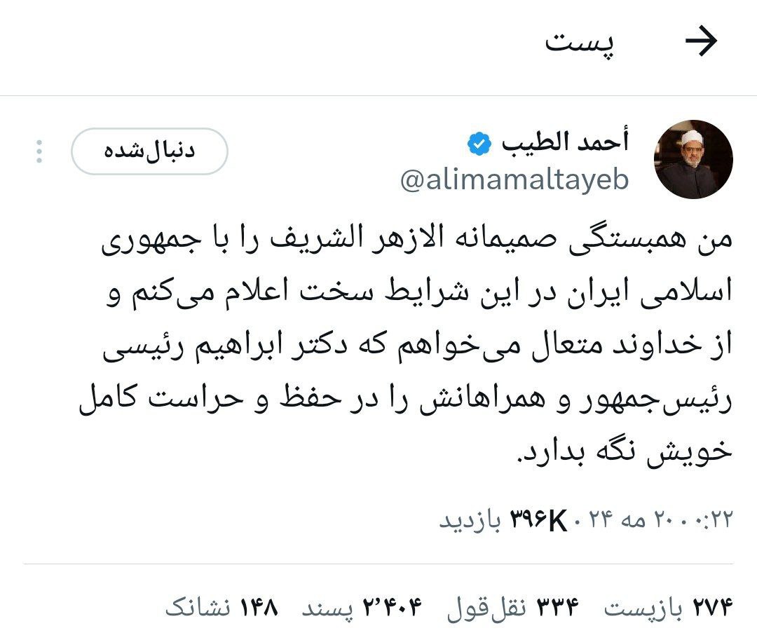 من همبستگی صمیمانه الازهر الشریف را با جمهوری اسلامی ایران در این شرایط سخت اعلام میکنم و از خداوند متعال میخواهم که دکتر ابراهیم رئیسی رئیسجمهور و همراهانش را در حفظ و حراست کامل خویش نگه بدارد.