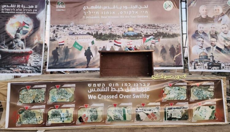 ونصبت كتائب القسام منصةَ العرض مع عدة عبارات توصل من خلالها رسائل للاحتلال “الإسرائيلي”، أبرزها : نحن الجنود يا قدس فاشهدي”، بالإضافة إلى صور لمستوطنات غلاف غزة التي دخلها المقاومون في السَّابع من أكتوبر وتمكنوا من السيطرة عليها وأسر مئات الجنود الصهاينة، وتوسطت الصّور عبارة “عبرنا مثل خيط الشمس”.