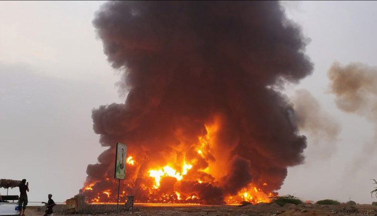 وتكافح فرق الدفاع المدني اليمنية لإطفاء الحرائق والنيران المشتعلة في منشآت تخزين النفط المجاورة لميناء الحديدة.
