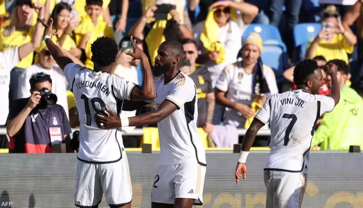حل أوريلين تشواميني بديلا ليسجل من ضربة رأس قبل نهاية المباراة، ويضمن لريال مدريد قلب تأخره بهدف إلى انتصار 2-1 على لاس بالماس في الدوري الإسباني، السبت.