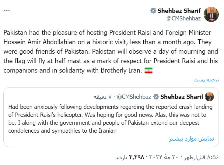 قدم رئيس الوزراء الباكستاني شهباز شريف باستشهاد الرئيس الإيراني السيد إبراهيم رئيسي، معلنًا يوم حداد في باكستان احترامًا للرئيس ورفاقه وتضامنا مع إيران.