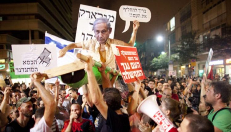 ورفع المتظاهرون لافتات تحمل صور نتنياهو وكتب عليها “ارحل! لم يتبق هناك شيء لتقوم بتدميره”.