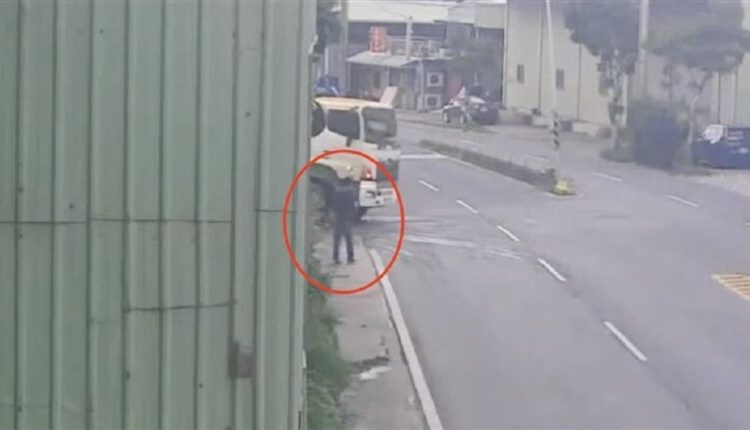 أظهر مقطع فيديو لحظات تحبس الأنفاس من نجاة رجل كان يسير على قارعة الطريق من موت محقق خلال حادث سير وقع بين شاحنتين في منطقة غوانيين الصناعية في تايوان.