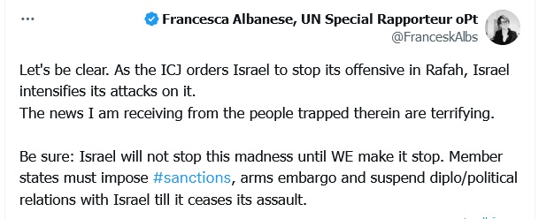 وقالت ألبانيز في تدوينة على منصة “إكس” إن “إسرائيل كثّفت هجماتها على مدينة رفح (جنوب قطاع غزة) بعد أن أمرتها محكمة العدل الدولية بوقف عمليتها في المدينة”.