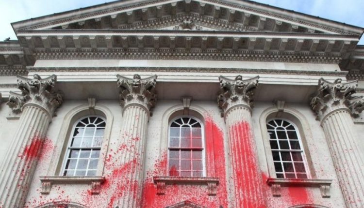 وأعلنت منظمة “العمل الفلسطيني” عن قيامها بتلطيخ واجهة المبنى التاريخي بالطلاء بهدف تسليط الضوء على سفك الدماء الفلسطينية في قطاع غزة على أيدي جيش الاحتلال الإسرائيلي وللمطالبة بقطع العلاقات مع شركات الأسلحة والمؤسسات الداعمة لحرب الإبادة الجماعية.