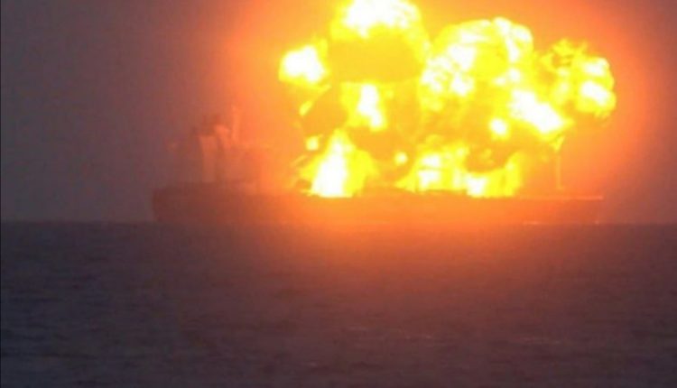 وأظهرت المشاهد لحظة احتراق السفينة جراء استهدافها من قبل القوات البحرية اليمنية وارتفاع السنة اللهب في جسم السفينة.