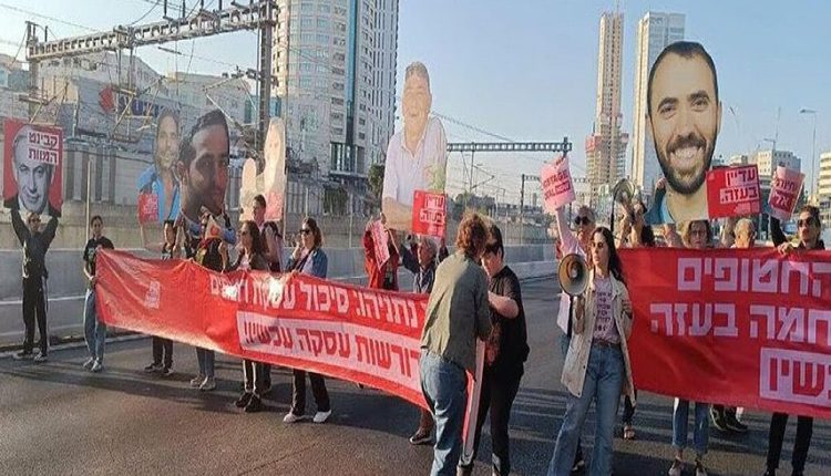 وأظهرت لقطات مصورة متداولة على منصات التواصل الاجتماعي لحظات قيام متظاهرين إسرائيليين بإغلاق طريق “أيالون” في “تل أبيب” ورفع لافتات ضخمة تدعو إلى استعادة الأسرى من قطاع غزة.