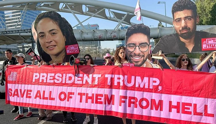 كما رفع المتظاهرون لافتة باللغة الإنجليزية مكتوب عليها: “الرئيس (الأمريكي دونالد) ترامب: أعدهم (الأسرى) من الجحيم”.