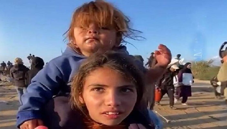 ننگے پاؤں اور بہن کو کندھے پر اٹھائے فلسطینی لڑکی کی شمالی غزہ میں سفر کرتے لڑکی نے لوگوں کے دل دہلا دیئے۔
