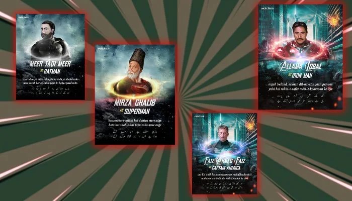 ان تصاویر میں شاعر میر تقی میر کو بیٹ مین، مرزا غالب کو سپر مین، علامہ محمد اقبال کو آئرن مین، فیض احمد فیض کو کیپٹن امریکا، جون ایلیا کو ڈاکٹر اسٹرینج، پروین شاکر کو بلیک وِڈو اور اکبر الہ آبادی کو ڈیڈ پول بنا کر پیش کیا گیا۔