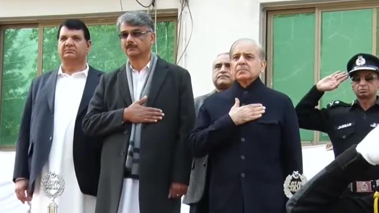 وزیراعظم شہبازشریف کی آمد پر پاکستان کا قومی ترانہ بجایا گیا، وزیر امور کشمیر وگلگت بلتستان انجینئر امیر مقام بھی وزیراعظم کے ہمراہ تھے۔