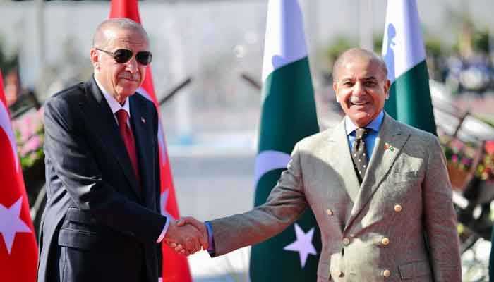 گزشتہ روز رات دیر گئے ترک صدر خاتون اول اور سرمایہ کاروں اور تاجر رہنماؤں کے ہمراہ نور خان ائیر بیس پہنچے تھے جہاں صدر پاکستان آصف علی زرداری اور وزیراعظم شہباز شریف نے ان کا شاندار استقبال کیا گیا۔