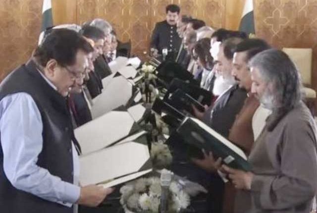 صدرمملکت ڈاکٹر عارف علوی کی جانب سے نئی کابینہ سے حلف لینے سے معذرت کے بعد چیئرمین سینیٹ اورقائم مقام صدر صادق سنجرانی نےنئی کابینہ سے حلف لیا۔ وفاقی کابینہ میں 30 وزرا ، 4 وزرائے مملکت اور3 مشیر شامل ہیں۔