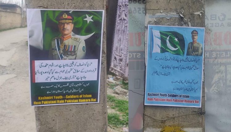 مقبوضہ کشمیر میں پاکستان کے یوم دفاع کی مناسبت سے آرمی چیف جنرل عاصم منیر کے پوسٹر چسپاں کردئیے گئے۔کشمیر میڈیا سروس کے مطابق میں آج ( بدھ کو) پاکستان کا یوم دفاع منایا جائے گا۔ اس موقع پر سرینگر کے مختلف علاقوں میں آرمی چیف جنرل عاصم منیر کی تصاویر والے پوسٹر چسپاں کر دئیےگئے۔