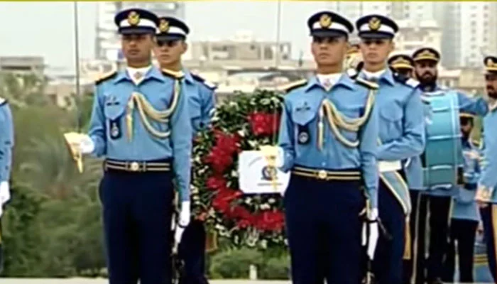 کراچی میں مزار قائد پر گارڈز تبدیلی کی تقریب کے مہمان خصوصی پی اے ایف اصغرخان اکیڈمی کے ائیرآفیسرکمانڈنگ ائیروائس مارشل غضنفر لطیف ہیں۔