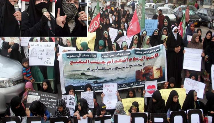 روضہ رسولﷺ اور جنت البقیع کے دفاع کی خاطر جانوں کا نذرانہ پیش کرنے سے دریغ نہیں کریں گے، مدینہ منورہ اور مکہ مکرمہ میں ہونے والے دہشتگردانہ حملوں کے پس پردہ عناصر اقتدار کی ہوس میں مکہ مکرمہ اور مدینہ منورہ کو بھی داؤ پر لگا چکے ہیں، اہلبیت اطہارؑ اور صحابہ کرامؓ کے مزارات کو منہدم کرنا دنیا کی سب سے بڑی دہشتگردی ہے، ان خیالات کا اظہار مقررین نے کراچی پریس کلب کے سامنے امامیہ اسٹوڈنٹس آرگنائزیشن پاکستان کراچی ڈویژن شعبہ طالبات کے زیِر اہتمام آٹھ شوال یوم انہدام جنت البقیع کی مناسبت سے منعقدہ احتجاجی مظاہرے سے خطاب کرتے ہوئے کیا۔ احتجاجی مظاہرے میں خواتین، طالبات سمیت بچوں نے کثیر تعداد میں شرکت کی، مظاہرین نے ہاتھوں میں بینرز اور پلے کارڈز اٹھا رکھے تھے، جن پر امریکا مردہ باد، اسرائیل نامنظور، آل سعود کی دہشتگردی مردہ باد سمیت جنت البقیع اور جنت المعلیٰ میں موجود اہلبیت رسولﷺ اور صحابہ کرامؓ کے مزارات مقدسہ کی ازسرنو تعمیر کے مطالبات درج تھے۔ اس موقع پر مظاہرین نے مردہ باد امریکا اور اسرائیل نامنظور سمیت آل سعود کی دہشتگردی کیخلاف فلک شگاف نعرے بلند کئے۔