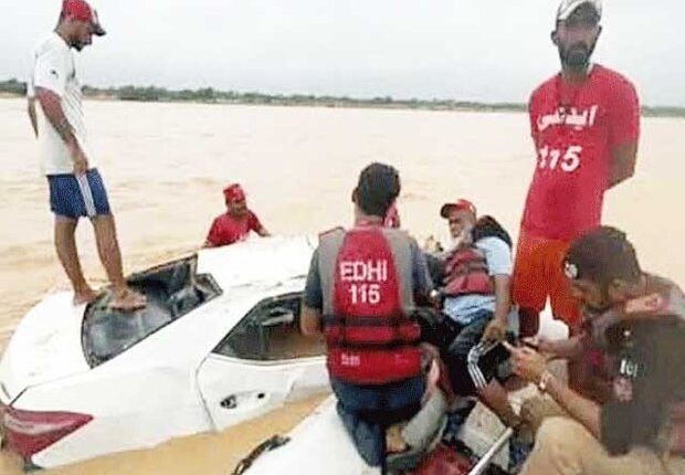 مددگار 15 کو شہزاد نامی شہری کی جانب سے گاڑی ڈوبنے کی اطلاع دی گئی، شہری گلشن حدید کا رہائشی ہے۔ ایس ایچ او میمن گوٹھ کا کہنا ہے کہ اطلاع ملنے پر ریسکیو ٹیموں اور پولیس موقع پر پہنچ گئی تاہم پانی کی سطح بلند ہونے کے باعث امدادی سرگرمیوں میں مشکلات درپیش آئیں۔سیکریٹری محکمہ اطلاعات عبدالرشید سولنگی کا کہنا ہے کہ ڈوبنے والی فیملی کی تلاش کے لیے ایدھی کے رضا کار سرچ آپریشن میں جاری ہے، متاثرہ خاندان کو مقامی افراد نے سیلابی پانی میں جانے سے منع کیا تھا لیکن تنبیہہ کو نظر انداز کرتے ہوئے ڈرائیور نے سفر جاری رکھا۔
