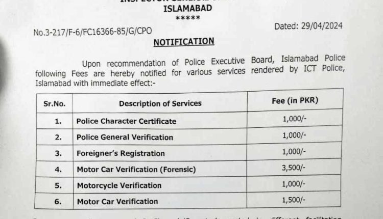 ترجمان نے بتایا کہ پولیس کریکٹر سرٹیفکیٹ کیلئے ہزار روپے، پولیس جنرل ویری فکیشن کیلئے ہزار روپے اور فارنر رجسٹریشن سرٹیفیکٹ پر بھی ہزار روپے فیس کا اطلاق کیا گیا ہے۔