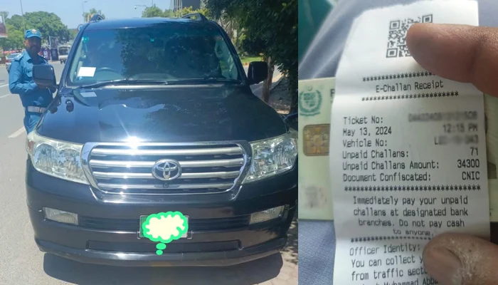 سی ٹی او کے مطابق لگژری گاڑی کے ڈرائیور نے 71 ای چالان جمع نہیں کروائے، پکڑے جانے پر گاڑی کے ڈرائیور نے موقع پر 34 ہزار 300 روپےجرمانہ جمع کرایا۔