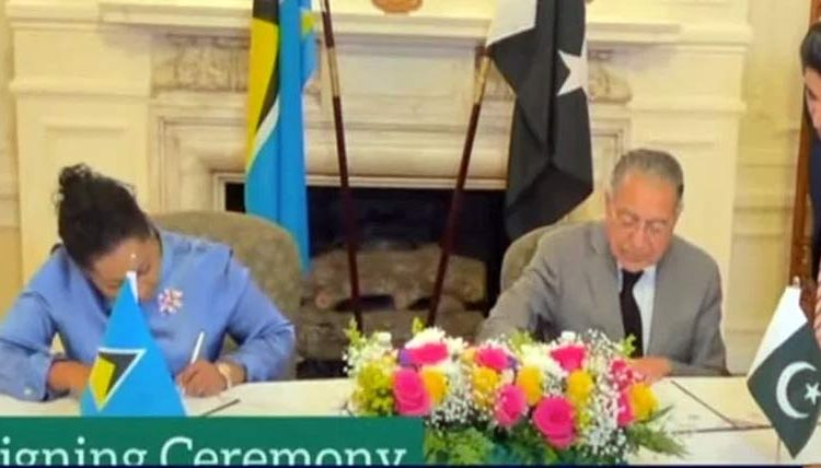 اقوام متحدہ میں پاکستان کے مستقل مندوب منیر اکرم اور سینٹ لوشیا سے ان کی ہم منصب سفیر مینیسا رامبالی نے پاکستان مشن میں ایک سادہ تقریب میں مشترکہ اعلامیہ پر دستخط کیے۔