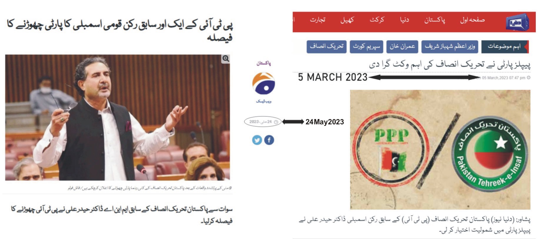 اسلام آباد(شوریٰ نیوز)نجی ٹی وی چینلز نےڈاکٹر حیدر علی سے دوبارہ پی ٹی آئی چھڑوا دی جب کہ اُن کے حوالے سے5مارچ کو یہ خبریں جاری کی گئی تھی کہ وہ پی ٹی آئی چھوڑ کر پیپلز پارٹی میں شامل ہو چکے اور اسی حوالے سے نجی میڈیا نے اُن کے حوالے سے تصاویر بھی جاری کی تھیں 5مارچ کو جاری کی گئی تصاویر میں ڈاکٹر علی حیدر کو چیئرمین پیپلز پارٹی بلاول بھٹوزرداری اور رہنمائوں کو دیکھا جاسکتا ہے ۔یاد رہے کہ 5 مارچ کو جاری کی گئی خبر اور تصویر کے بعد6 مارچ کو ڈاکٹر حیدر علی نے اپنے وضاحتی بیان میں کہاتھا کہ سیاسی شخصیات کے مابین ملاقاتیں سیاسی اور جمہوری نظام کا حصہ ہے. یہ بات درست ہے کہ کئی پارٹیوں کے قائدین کی طرف سے رابطے کیے جارہے ہیں لیکن تا حال پاکستان تحریک انصاف کا حصہ ہوں اور پارٹی چھوڑنے کا کوئی فیصلہ نہیں کیا. جمہوریت پر یقین رکھتا ہوں اور تمام فیصلے اپنے کارکنان کی مشاورت سے کرتا ہوں. کسی بھی سیاسی فیصلے سے پہلے کارکنان سے مشاورت کریں گے کیونکہ میرے کارکن میرا سب سے قیمتی اثاثہ ہے اور اٗن کی رائے اور مفادات مجھے ہر چیز سے زیادہ عزیز ہیںنجی ٹی وی کی جانب سے آج مورخہ 24مئی 2023 کو جاری کی گئی خبر میںلکھا کہ سوات سے تعلق رکھنے والے پاکستان تحریک انصاف کے سابق ایم این اے ڈاکٹر حیدر علی نے9 مئی کے پرتشدد واقعات کے باعث پی ٹی آئی چھوڑنے کا فیصلہ کرلیاڈاکٹرحیدر علی کل پی ٹی آئی چھوڑنے کا اعلان کریں گے۔واضح رہے کہ 9 مئی کے پرتشدد واقعات کے بعد پاکستان تحریک انصاف کے کئی رہنما پارٹی چھوڑنے کا اعلان کرچکے ہیں۔