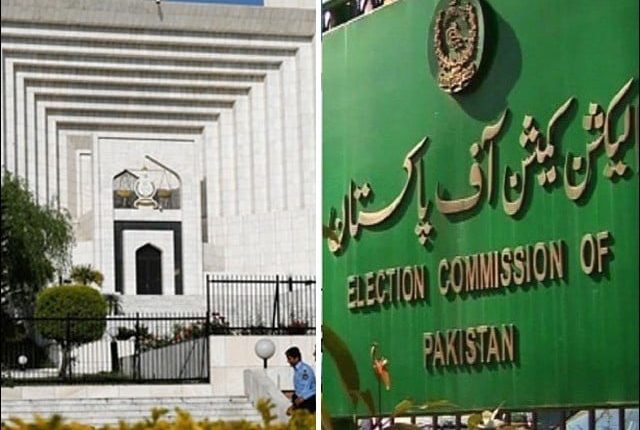 چیف جسٹس قاضی فائز عیسیٰ اور جسٹس نعیم افغان پر مشتمل بینچ نے الیکشن ٹربیونلزکی تشکیل کے خلاف الیکشن کمیشن کی اپیل پر سماعت کی جس سلسلے میں الیکشن کمیشن کے وکیل سکندربشیر اور پی ٹی آئی وکیل سلمان اکرم راجہ عدالت میں پیش ہوئے۔