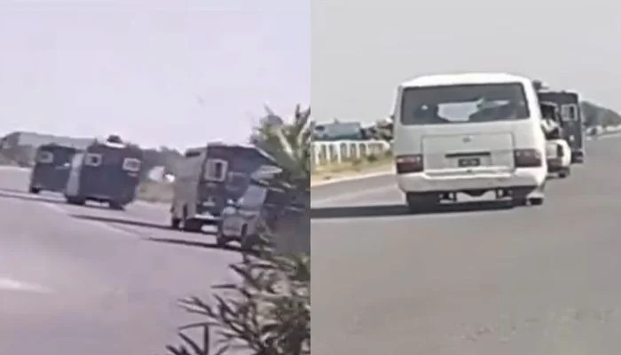 ویڈیو میں قیدیوں کی وینز کو قافلے کی صورت میں جاتے ہوئے دیکھا جاسکتا ہے۔