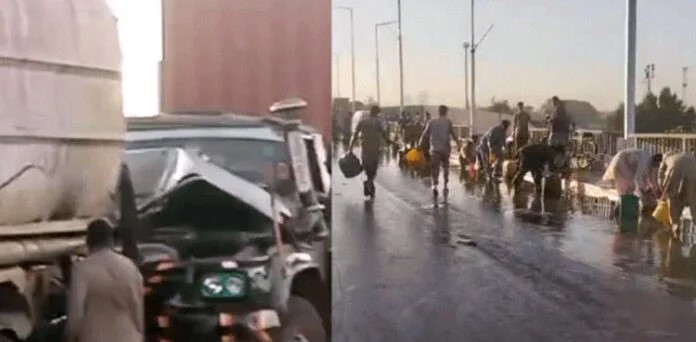 آئل ٹینکر کو پیش آنے والے حادثے کے بعد شہریوں ڈرمز میں آئل جمع کرنے پہنچ گئے، واقعے میں متعدد افراد پھسلن کے باعث گر کر زخمی ہو گئے۔