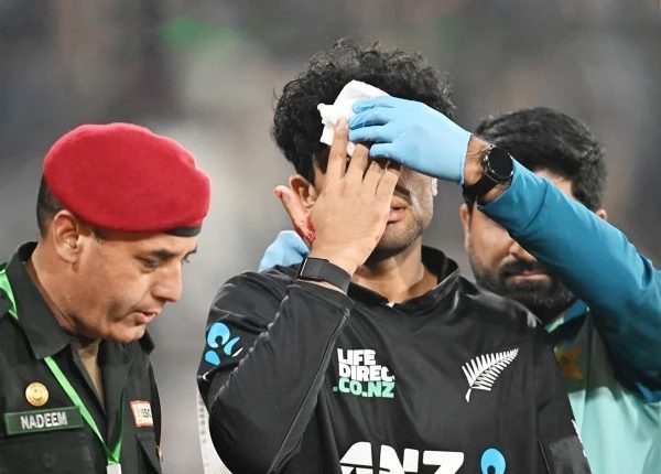 قذافی اسٹیڈیم میں کھیلے گئے میچ میں مہمان نیوزی لیںڈ کی ٹیم نے پاکستان کو 78 رنز سے شکست دیکر سہ ملکی سیریز کا فاتحانہ آغاز کیا تاہم میچ کے دوران کیچ تھامنے کی کوشش میں کیوی اوپنر راچن رویندرا کے چہرے پر گیند لگ گئی، جس کے باعث وہ زخمی ہوگئے۔