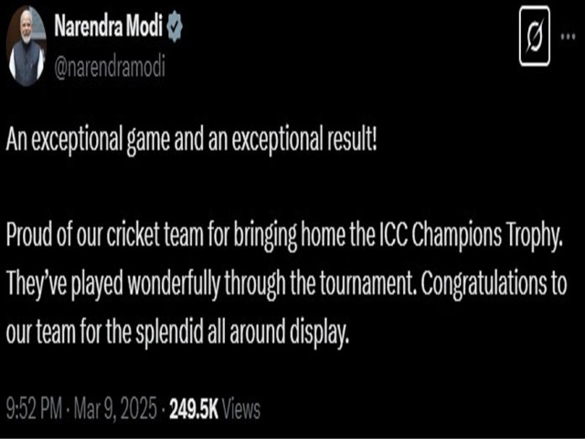 بھارتی وزیراعظم نریندر مودی نے ٹیم کو مبارکباد دیتے ہوئے اسے ایک غیر معمولی نتیجہ قرار دیا۔ انہوں نے سوشل میڈیا پلیٹ فارم ایکس پر لکھا کہ ایک غیر معمولی کھیل اور ایک غیر معمولی نتیجہ، ہماری کرکٹ ٹیم کو آئی سی سی چیمپئنز ٹرافی جیتنے پر فخر ہے۔ انہوں نے ٹورنامنٹ میں شاندار کھیل پیش کیا۔ ہماری ٹیم کو شاندار آل راؤنڈ پرفارمنس پر مبارکباد۔