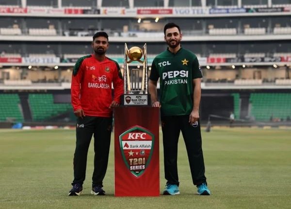 ٹرافی کی رونمائی دونوں ٹیموں کے کپتانوں سلمان علی آغا اور لٹن داس نے کی۔