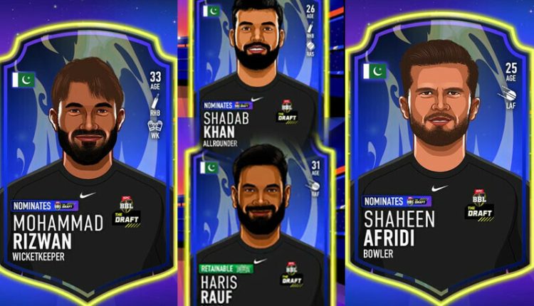 پاکستان کے محمد رضوان، شاہین شاہ آفریدی ، شاداب خان اور حارث روف نے آسٹریلیا کی بگ بیش لیگ کے ڈرافٹ کے لیے رجسٹریشن کرالی۔کھیلوں کی ویب سائٹ ’کرک انفو‘ کے مطابق بگ بیش لیے کے ڈرافٹ 19 جون کو ہوگا جس میں تقریبا 600 کھلاڑی نے رجسٹریشن کرائی ہے، ڈرافٹ میں برسبین ہیٹ کو پہلا کھلاڑی منتخب کرنے کا موقع ملے گا۔پاکستان کے مینز کرکٹرز کے ساتھ ویمن کپتان فاطمہ ثنا نے بھی رجسٹریشن کرائی ہے، ڈرافٹ کے لیے مکمل فہرست اور کھلاڑیوں کی دستیابی کی تفصیلات جلد جاری کردی جائیں گی۔انگلینڈ کے سیم کرن اور ایلکس ہیلز، نیوزی لینڈ کے لوکی فرگوسن اور ٹم ساؤتھی، سری لنکا کی کشال پریرا اور ویسٹ انڈیز کے شمار جوزف 10 کھلاڑیوں کی پہلی ڈرافٹ لسٹ میں شامل ہیں۔
