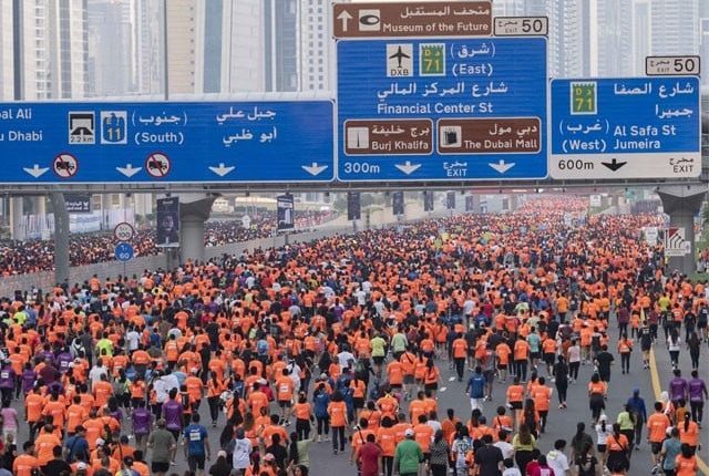 دبئی کی سب سے مصروف ترین سڑک شیخ زید روڈ پر نارنجی رنگ کی شرٹ میں ملبوس انسانوں کا سیلاب امڈ آیا۔ مختلف عمروں سے تعلق رکھنے والے مردوں، خواتین اور بچوں نے دبئی رن میں جوش و خروش سے حصہ لیا۔