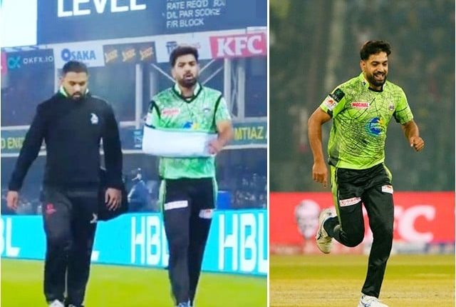 قذافی اسٹیڈیم لاہور میں کھیلے گئے میچ میں لاہور قلندرز کے فاسٹ بولر حارث رؤف میچ کے اختتام لمحات میں کراچی کنگز کے بیٹر حسن علی کا کیچ لینے کے دوران کندھے کے بَل گر کر زخمی ہوگئے تاہم انہیں فوری طبی امداد فراہم کردی گئی جبکہ سی ٹی اسکین بھی کروایا گیا ہے۔