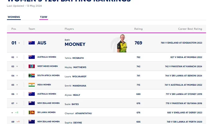 بیٹنگ رینکنگ میں آسٹریلیا کی تھالیہ مک گرا کی دوسری اور ویسٹ انڈیز کی ہیلی میتھیو کی تیسری پوزیشن ہے جب کہ ویمن ٹاپ ٹین بیٹرز میں پاکستان کی کوئی کھلاڑی شامل نہیں۔