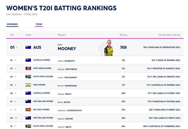 دبئی، انٹرنیشنل کرکٹ کونسل (آئی سی سی ) کی جانب سے جاری بیٹنگ رینکنگ میں آسٹریلیا کی بیتھ مونی بدستور پہلے نمبر پر موجود ہیں۔