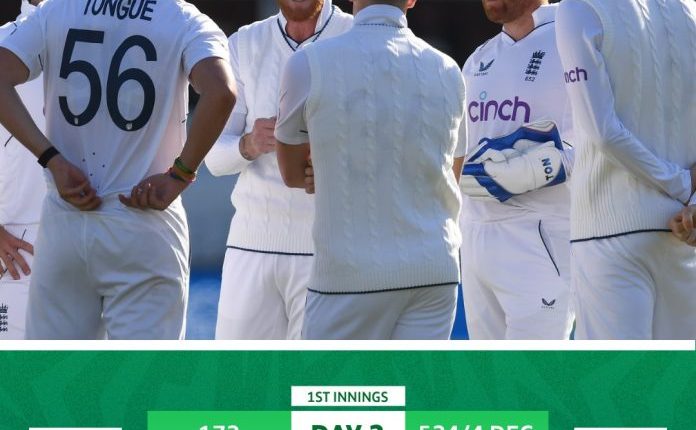 لارڈز (شوریٰ نیوز)لارڈز ٹیسٹ میں انگلینڈ کی گرفت مضبوط ہو گئی،آئرش ٹیم نے اپنی دوسری اننگز میں 3 وکٹوں کے نقصان پر 97 رنز بنا لئے ،انگلینڈ نے آئرلینڈ کے خلاف واحد ٹیسٹ میچ کے دوسرے روز اپنی پہلی اننگز 524 رنز پر ڈیکلیئر کرکے میچ پر گرفت مضبوط کرلی، اولی پوپ نے شاندار ڈبل سنچری سکور کی، بین ڈکٹ 182 رنز بنا کر آئوٹ ہوئے، آئرش ٹیم نے اپنی دوسری اننگز میں 3 وکٹوں کے نقصان پر 97 رنز بنا لئے جبکہ اسے خسارہ ختم کرنے کیلئے مزید 255 رنز درکار ہیں۔ کو لارڈز کے تاریخی گرائونڈ میں کھیلے جارہے واحد ٹیسٹ میچ کے دوسرے روز انگلینڈ نے اپنے گزشتہ روز کے 152 رنز ایک کھلاڑی آئوٹ پر اننگز کا دوبارہ آغاز کیا۔ بین ڈکٹ 60 اور اولی پوپ 29 رنز کے ساتھ وکٹ پر موجود تھے، دونوں بیٹرز نے شاندار بیٹنگ کا سلسلہ جاری رکھا اور دوسری وکٹ پر 252 رنز کی شراکت قائم کی۔اولی پوپ نے اپنی شاندار ڈبل سنچری مکمل کی، وہ 205 رنز بنا کر آئوٹ ہوئے جبکہ بین ڈکٹ نے بھی بہترین بیٹنگ کرتے ہوئے 182 رنز بنائے۔ اس کے بعد آنے والے بیٹر جو روٹ نے 56 رنز کی اننگز کھیلی جبکہ ہیری بروک 9 رنز پر وکٹ پر موجود تھے کہ انگلش کپتان نے 524 رنز 4 کھلاڑی آئوٹ پر اپنی اننگز ڈیکلیئر کرنے کا اعلان کردیا۔ آئرش بائولر اینڈی میک برائن نے دو، گراہم ہیوم اور فیون ہانڈ نے ایک ایک کھلاڑی کو آئوٹ کیا۔آئرش ٹیم نے 354 رنز کے خسارے کے ساتھ اپنی دوسری اننگز کا مایوس کن آغاز کیا، دوسرے روز کھیل کے اختتام پر آئرلینڈ نے 3 وکٹوں کے نقصان پر 97 رنز بنائے۔ ہیری ٹیکٹر 33 اور لورکان ٹیوسر 21 رنز کے ساتھ وکٹ پر موجود ہیں۔ انگلینڈ کی طرف سے تینوں وکٹیں جوش ٹونگوی نے حاصل کیں۔ آئرلینڈ کو خسارہ ختم کرنے کیلئے مزید 255 رنز درکار ہیں۔ واضح رہے آئرلینڈ اپنی پہلی اننگز میں 172 رنز پر آئوٹ ہوگئی تھی۔