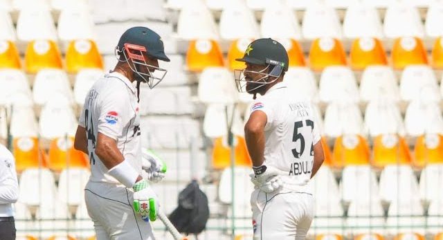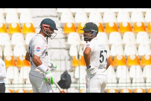 گرین شرٹس کی جانب سے عبد اللہ شفیق اور صائم ایوب نے اننگز کا آغاز کیا لیکن صائم ایوب جلد ہی صرف 4 رنز بنا کر پویلین لوٹ گئے تھے جس کے بعد بعد عبد اللہ شفیق اور شان مسعود نے ذمہ دارانہ بیٹنگ کرتے ہوئے ٹیم کا اسکور آگے بڑھایا تھا ۔ شان مسعود نے 2 چھکوں اور 10 چوکوں کی مدد سے اپنی سنچری مکمل کی بعد ازاں عبد اللہ شفیق 102 اور کپتان شان مسعود 151 رنز بنا کر کیچ آؤٹ ہو گئے ، پاکستان کی چوتھی وکٹ بابر اعظم کے طور پر گری جب سابق کپتان 30 رنز بناکر پویلین لوٹ گئے تھے۔