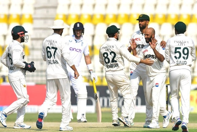 ملتان کرکٹ اسٹیڈیم میں کھیلے گئے میچ کے چوتھے روز انگلینڈ نے 2 وکٹوں کے نقصان پر 36 رنز سے اننگز کا آغاز کیا تو محض ایک رن کے اضافے کے بعد اولی پوپ 22 کے انفراد اسکور پر آؤٹ ہوئے، بعدازاں جو روٹ 18 اور ہیری بروک 16، جیمی اسمتھ 6، بریڈن کارس 27، جیک لیچ ایک اور شعیب بشیر صفر رن پر پویلین لوٹے۔ کپتان بین اسٹوکس کی مزاحمتی اننگز 37 رنز تک محدود رہی۔
