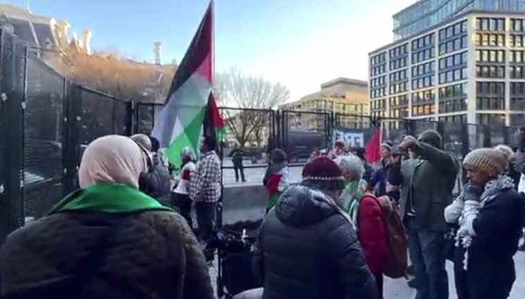 مظاہرین نے ٹرمپ اور نیتن یاہو کے خلاف شدید نعرے بازی کی، مظاہرین نے ’’غزہ برائے فروخت نہیں‘‘کے نعرے لگائے، مظاہرین نے فلسطینی پرچم اور پلے کارڈ اٹھا رکھے تھے۔