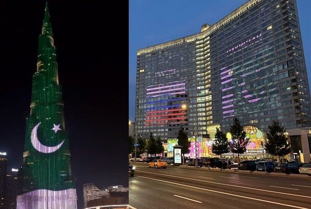 ماسکو(شوریٰ نیوز)یوم آزادی پر روس میں پہلی بار پاکستان کا پرچم ڈیجیٹل طریقے سے آویزاں کیا گیا، برج الخلیفہ بھی سبز اور سفید رنگوں میں رنگ گیا۔ پاکستان کا 76 واں یوم آزادی پاکستان کے ساتھ دنیا کے دیگر ممالک میں بھی جوش و جذبے کے ساتھ منایا گیا، اس موقع پر پاکستانیوں نے وطن سے محبت کا بھرپور اظہار کیا۔روس کے دارالحکومت ماسکو میں تین کثیرالمنزلہ عمارتوں پر پاکستان اور روس کے پرچم پہلی بار ڈیجیٹل طریقے سے آویزاں کیے گئے۔ماسکو کی شہری حکومت اور پاکستانی سفارتخانے نے پاکستان اور روس کے پرچموں کو ان عمارتوں پر آویزاں کرنے کے اقدامات کئے تھے جو دونوں ممالک کے درمیان تعلقات کی مضبوطی کا مظہر ہے۔عمارتوں پر دونوں ممالک کے پرچموں کے ساتھ روسی اور اردو زبان میں پاکستان اور روس کے نام بھی چل رہے تھے۔واضح رہے کہ پاکستان اور روس کے مابین سفارتی تعلقات کے 75 سال مکمل ہوچکے ہیں، 14 اگست کی رات ماسکو میں پاکستان کے پرچم کی نمائش ایک تاریخی لمحہ ہے۔دوسری جانب متحدہ عرب امارت میں دنیا کی بلند ترین عمارت برج الخلیفہ بھی ہر سال کی طرح اس سال بھی قومی پرچم کے رنگوں میں رنگ گئی۔اس خوبصورت منظر سے لطف اندوز ہونے کے لیے ہزاروں پاکستانی برج الخلیفہ کے اطراف جمع ہوئے جہاں انہوں نے تصاویر اور سیلفیاں بھی بنوائیں۔
